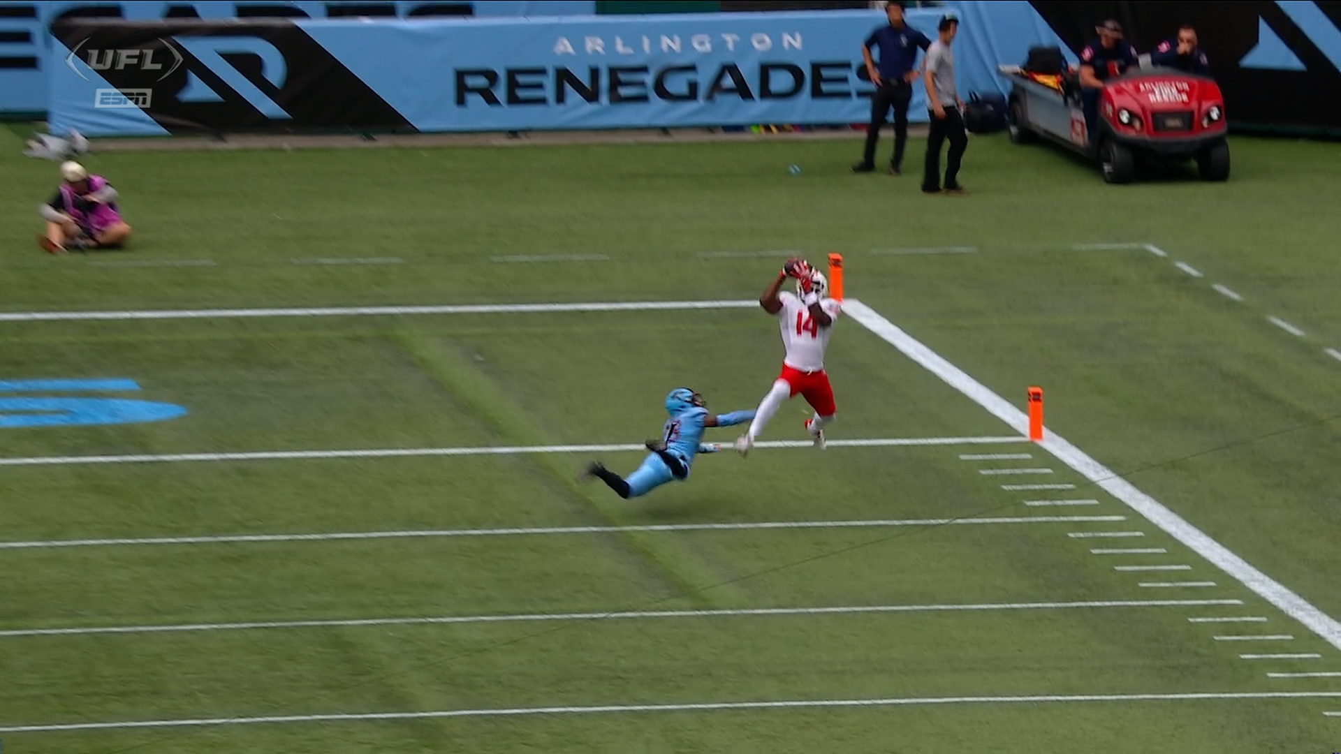 జోర్డాన్ టాము 37 గజాల టిడి పాస్లో కార్నెల్ పావెల్ తో అనుసంధానించాడు, ఇది డిసి డిఫెండర్స్ ఆర్లింగ్టన్ రెనెగేడ్స్ ఆధిక్యంలోకి ప్రవేశించడానికి సహాయపడింది.