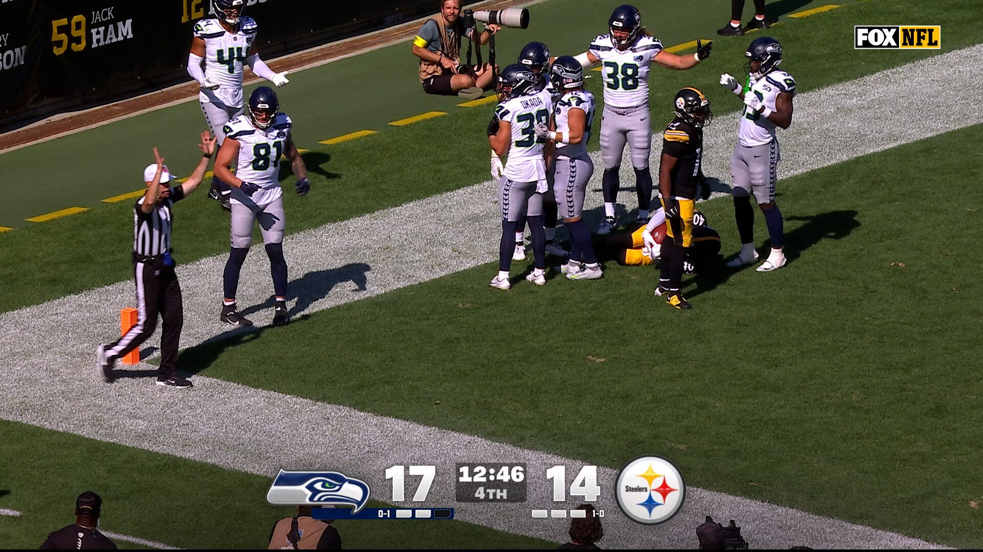 పిట్స్బర్గ్ స్టీలర్స్ పై సీటెల్ సీహాక్స్ ఆధిక్యాన్ని విస్తరించడానికి జార్జ్ హోలాని ఎండ్ జోన్లో ఒక మఫ్డ్ కిక్ను స్వాధీనం చేసుకున్నాడు.