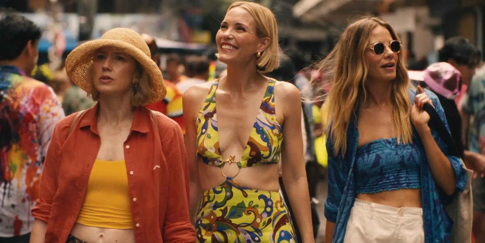 “ది వైట్ లోటస్” యొక్క మూడవ సీజన్లో ఐమీ లౌ వుడ్, షార్లెట్ లే బాన్ మరియు పాట్రిక్ స్క్వార్జెనెగర్. ఫాబియో లోవినో/హెచ్బిఓ