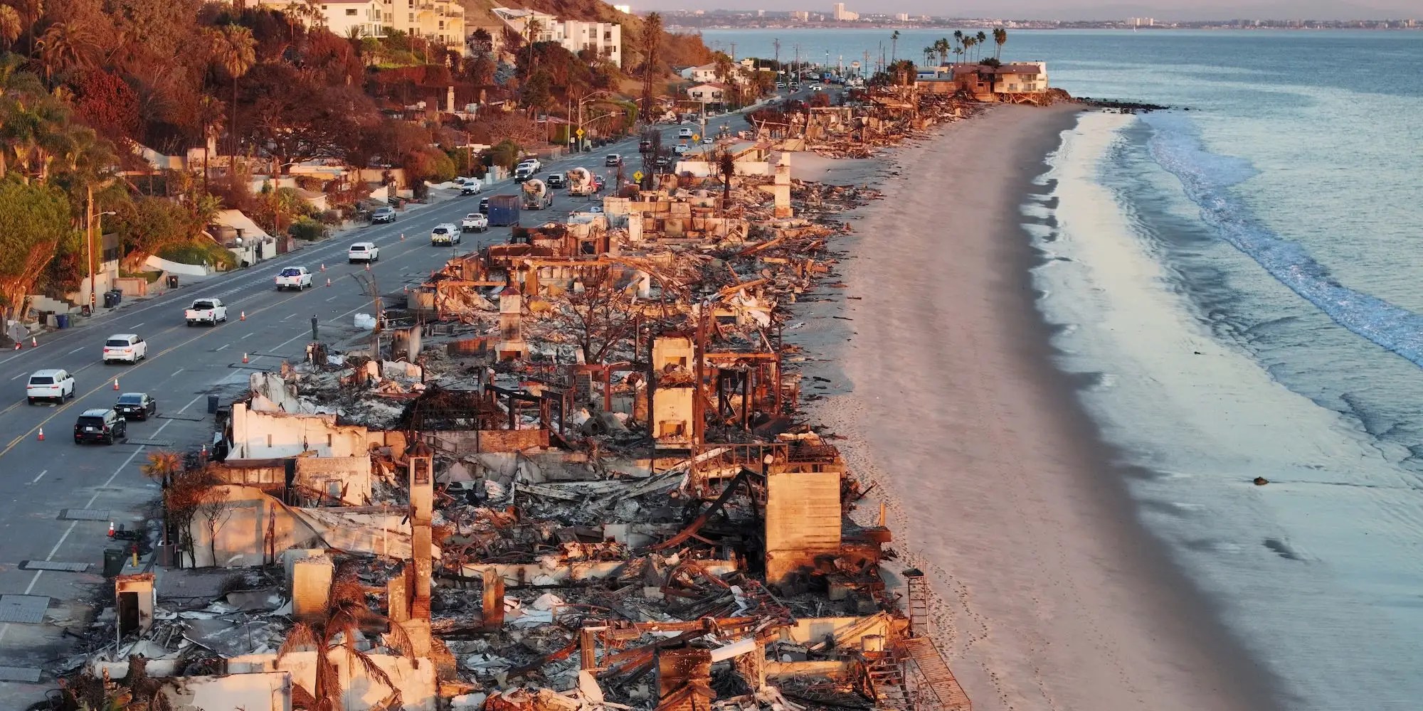 జనవరి 15న తీసిన వైమానిక ఫోటో కాలిఫోర్నియాలోని మలిబులో పాలిసాడ్స్ అగ్నిప్రమాదంలో ధ్వంసమైన బీచ్ ఫ్రంట్ ఇళ్లను చూపించింది.